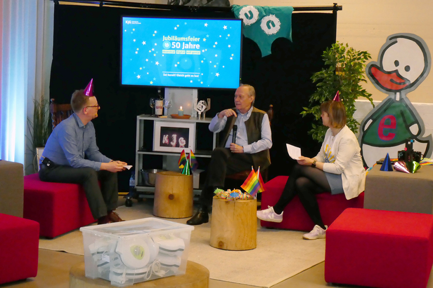 Der Ausgangsentwurf 1967 war ein Siebdruckmotiv von mir, entstanden in der Schulungstätte der Erzdiözese Köln in Altenberg und wurde bis Sommer 1968 für das 1. Große Deutschland-Treffen der KJG/KFG 1968 in Münster von mir für den Druck in den (auch von mir gestalteten) Programmheften und Postern optimiert.