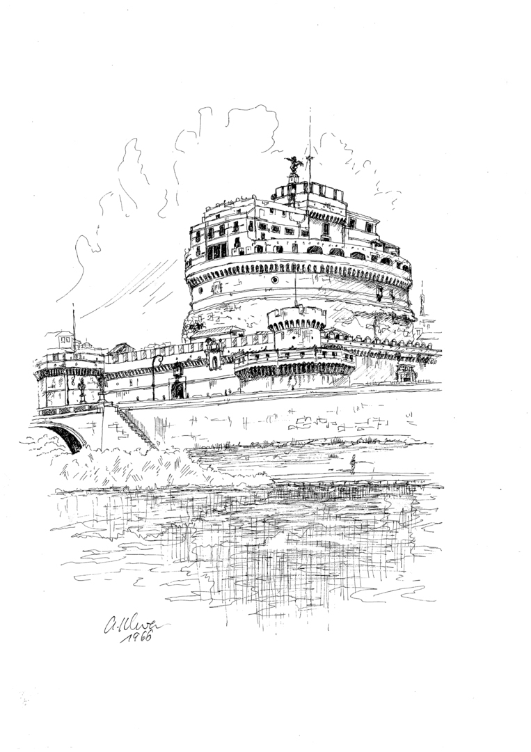 Engelsburg in Rom - 1966 - Tuschezeichnung vor Ort,